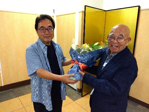 また、総会の最後に、大田新支部長が竹中前支部長へ感謝の言葉を伝え、花束を贈呈しました。竹中氏は学生時代に黒澤酉蔵先生から直接指導を受けた「健土健民」、「三愛精神」への思い、87歳の今でも、農業・農村を栄えさせたいとの強い思いを語られ、我々後輩へエールを送られました。