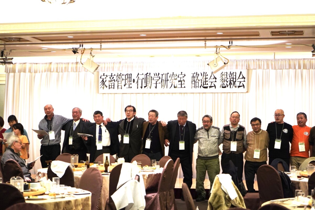同日18:00より、家畜管理・行動学研究室の卒業生を中心に組織された酪進会の総会が、新札幌のホテルエミシアにて開催されました。第14期から第63期(現4年生)卒業生および歴代教員の約140名が集まり、定例報告と役員確認の後、本年度の在学生(7名)と森田教授の卒業をお祝いしました。懇親会では、杉田慎二氏(35期、会長)および春田哲平氏(43期)の名司会で、楽しいひと時を過ごすことができました。最後は、「酪農讃歌」を全員で歌い閉会となりました。